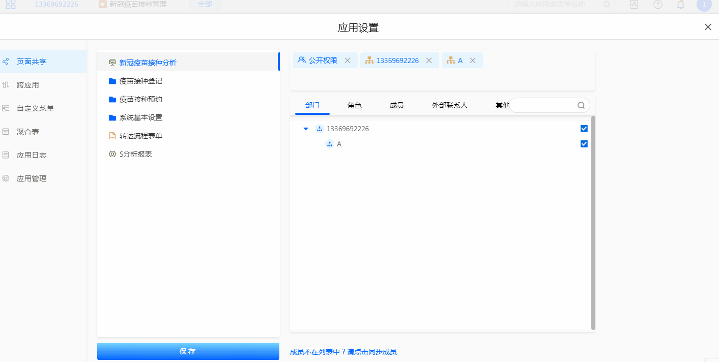 操作步骤:点击“设置” > 页面共享 > 选择任意一个表单或报表 > 勾选被共享的成员账号。