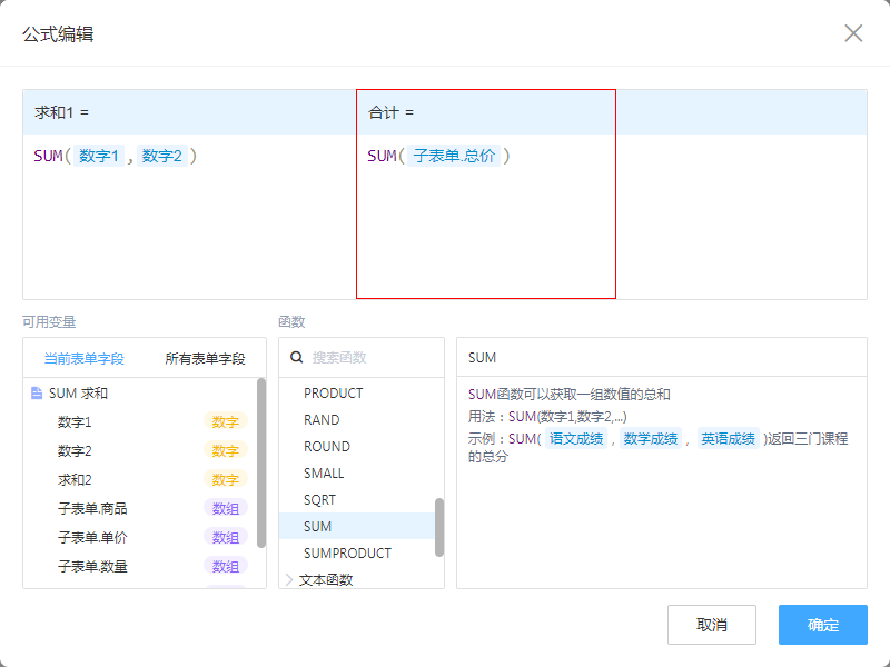 ②、在子表单里,统计总数、总价格时,就只能使用“SUM”函数。