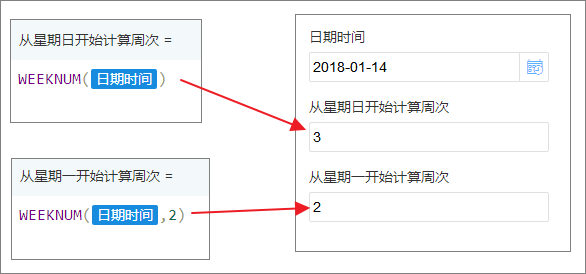| return_type(可选) | 整型 | 设定计算周数从星期几开始。(不填默认值为1,在数据助手和数据视图中类型必填) |