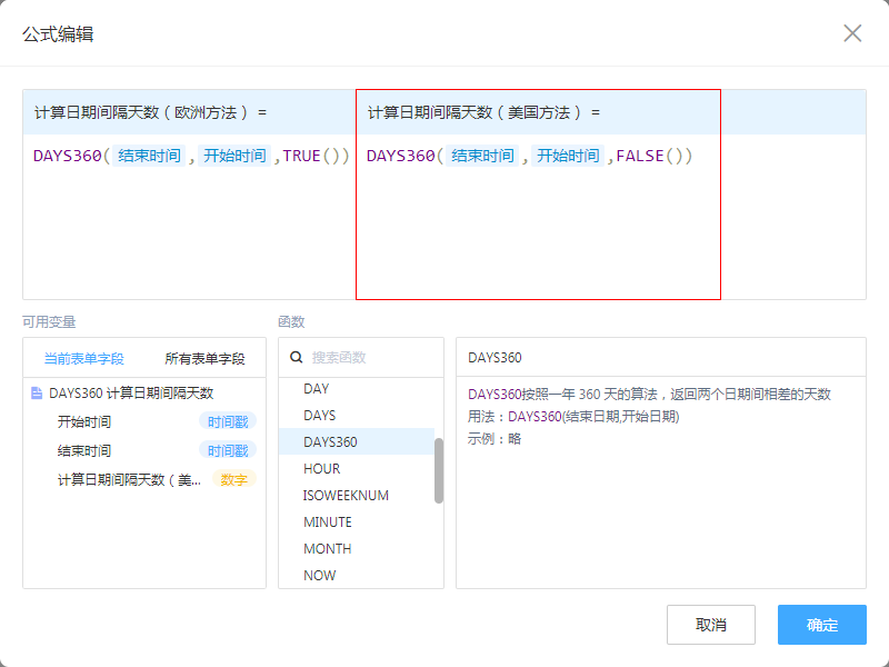 | method | 逻辑型 | 默认不填为FALSE()表示使用美国方法计算 TRUE()表示使用欧洲方法计算 |