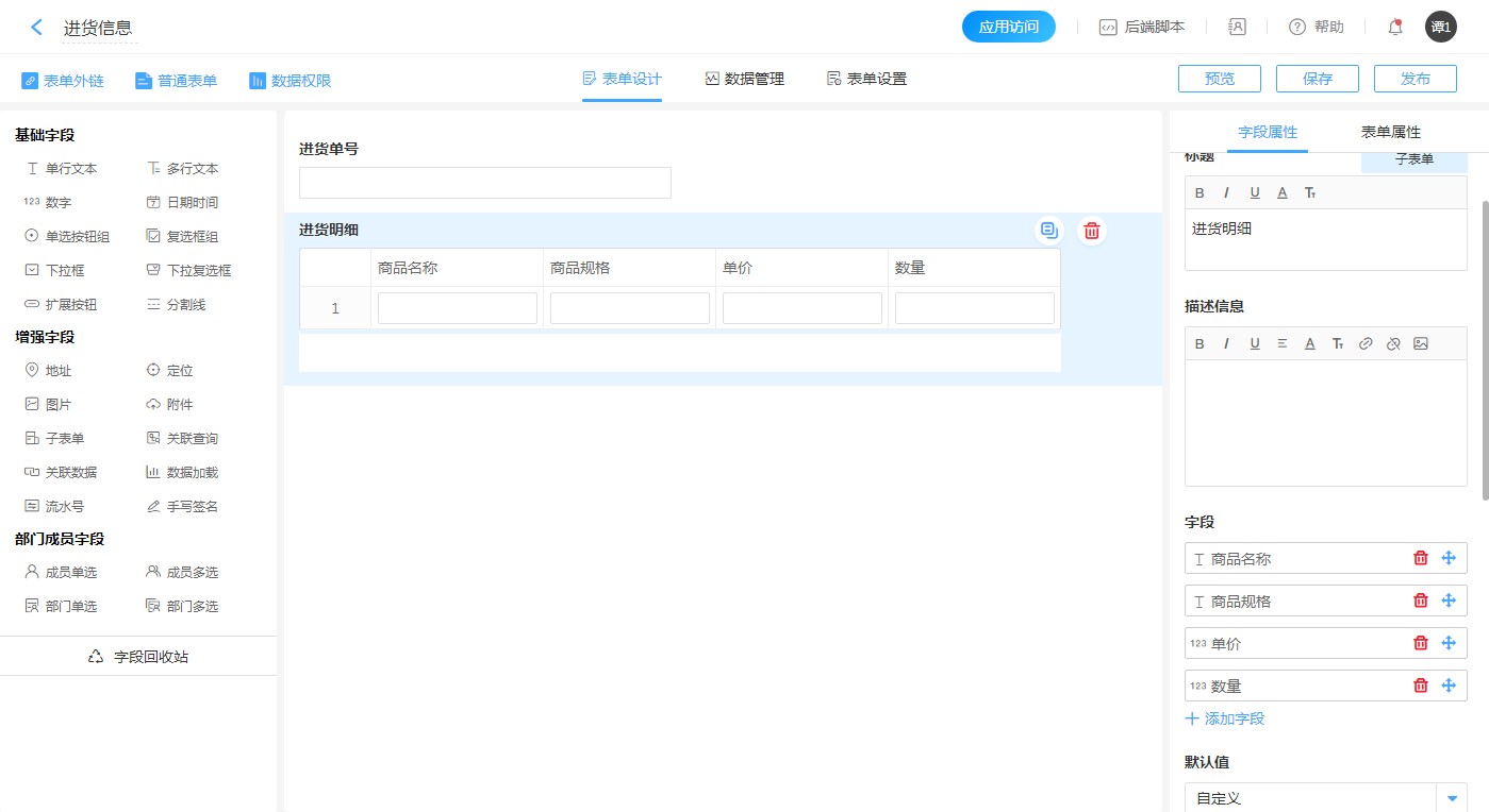 7.子表单联动,关联表单为【进货信息】,数据联动【进货信息】里面的“进货明细”中的“商品名称”、“商品规格”、“单价”、“数量”。