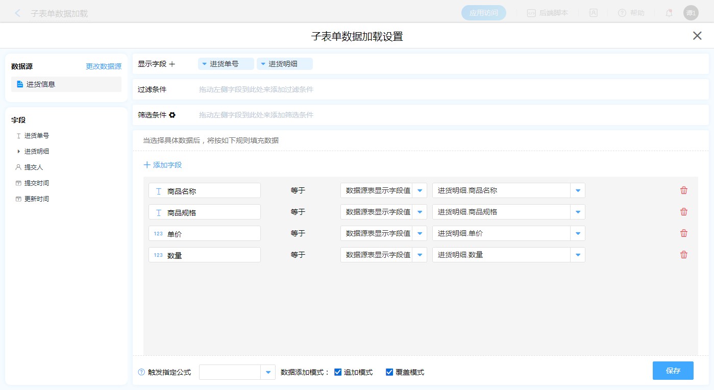 点击[添加字段]可添加当前表需要填充数据的字段,并设置与数据源表的字段对应关系。