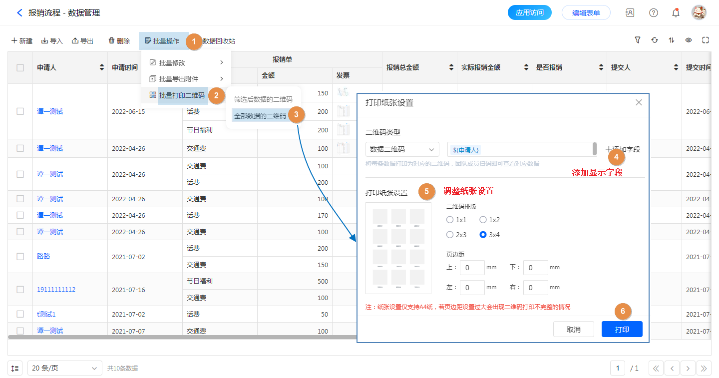 注:纸张设置仅支持A4纸,若页边距设置过大会出现二维码打印不完整的情况