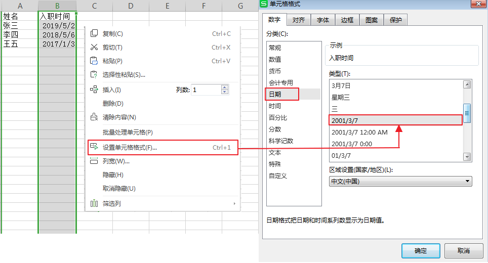Excel表中,单元格格式设置为「日期」;类型选择 2001/3/7这种类型 。这种时间类型可以匹配日期,也可以匹配日期时间。