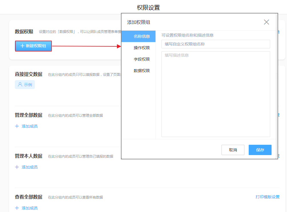 即给该权限组命名(权限组名称为必填)并可对该权限组进行简单描述(描述信息为选填)