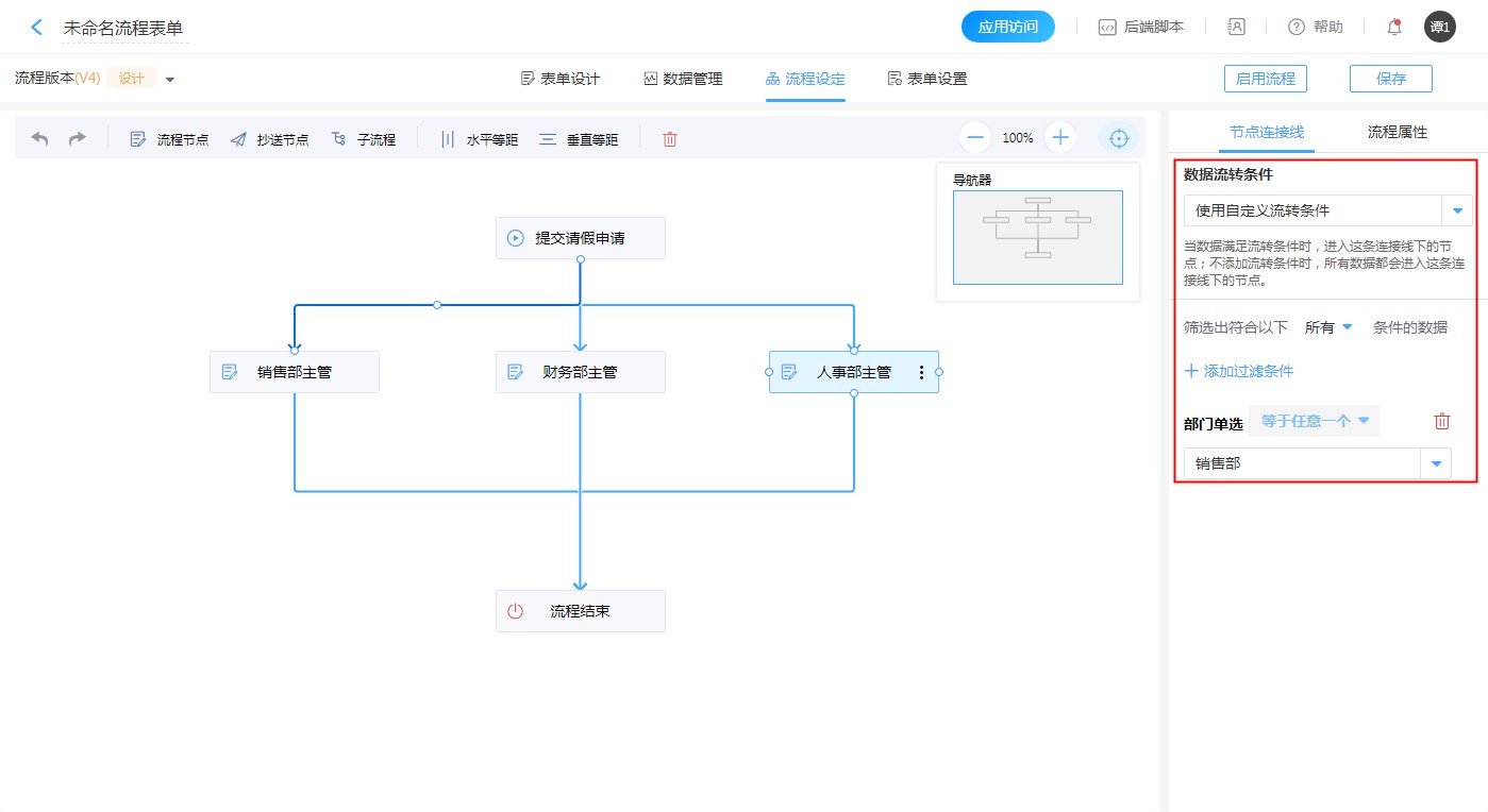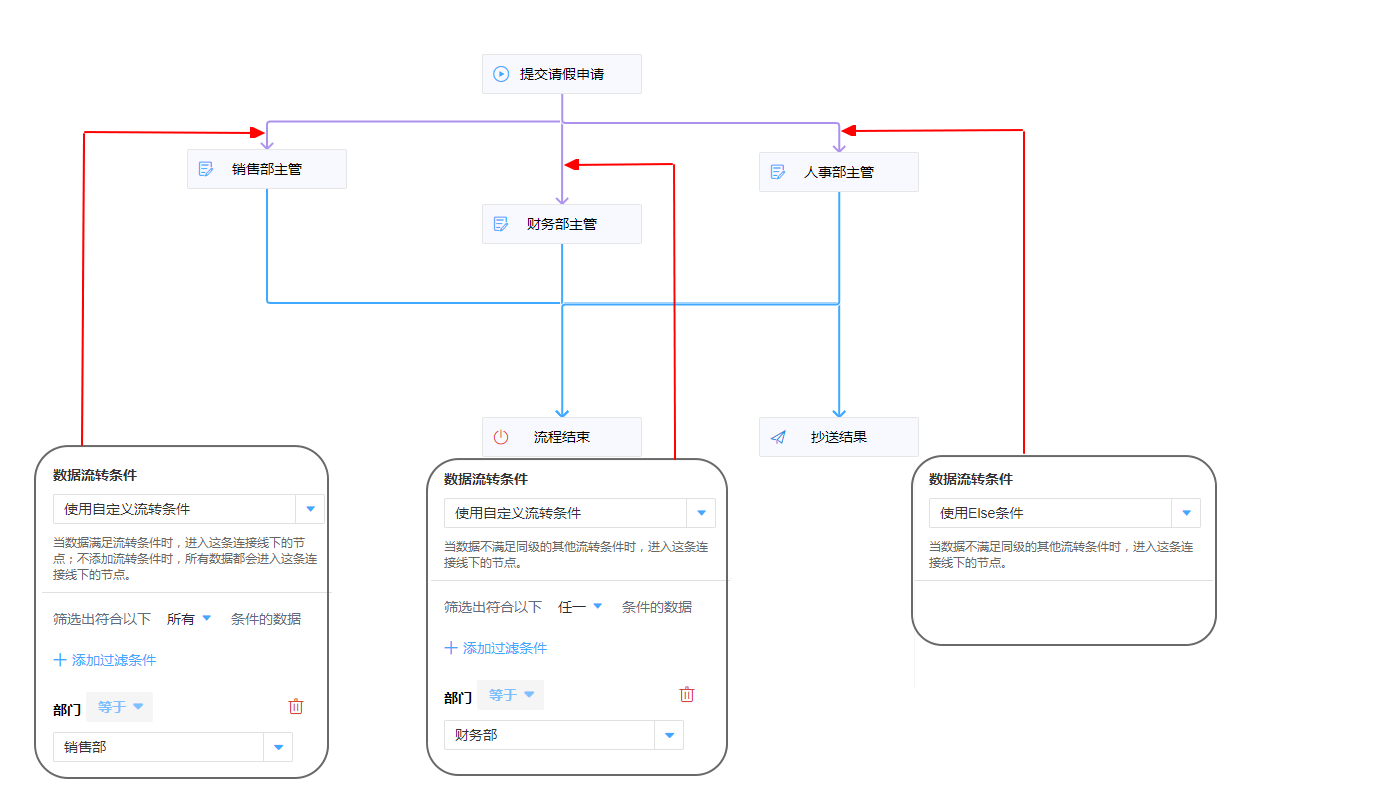 1. 给各个节点设置对应的流转条件。则在报销申请填写的数据,所属部门选择了【销售部】,则流转到【销售部】;选择了【财务部】,则流转到【财务部】;选择了非销售部、财务部时,数据就会流转到【人事部】。