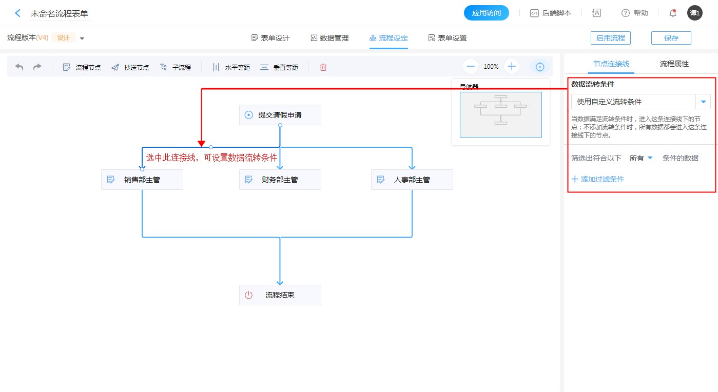 1. 点击【提交请假申请】与【销售部主管】节点之间的连接线,右侧出现【节点连线】设计面板,设置数据流转条件并添加过滤条件。