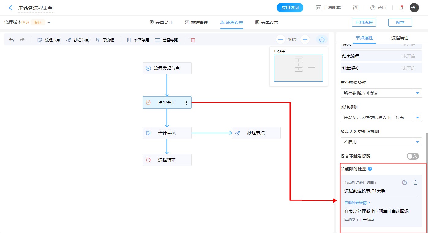 设置步骤: 【流程节点】——【节点属性】 ——【更多属性】——【节点限时处理设置】——【设置节点处理截止时间】——【选择自动回退】——【选择回退方式】