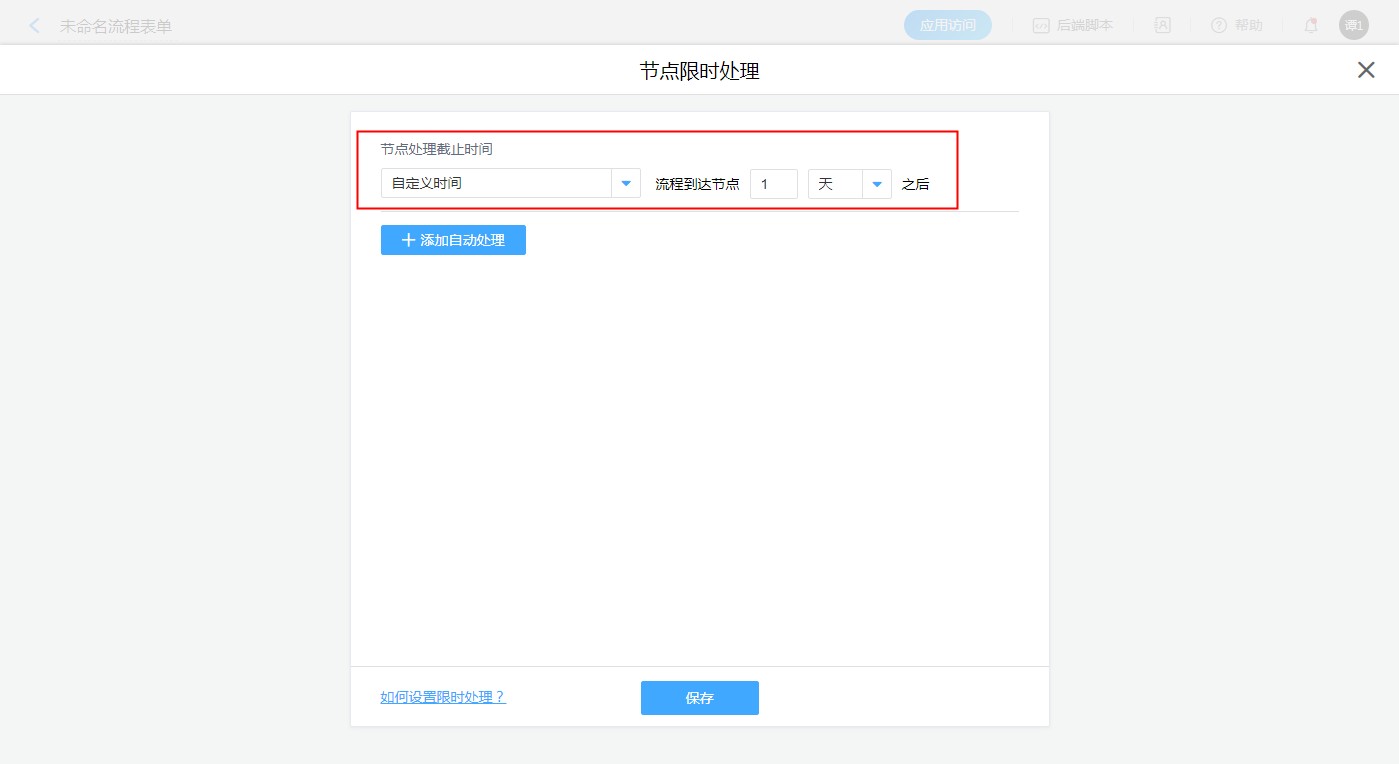 在设置节点限时处理时候,我们首先需要设置节点处理的截止时间。根据设置的节点处理截止处理时间,进行自动处理的相关设置。