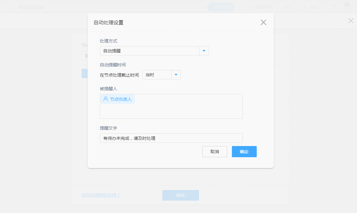 选择好处理方式后,还需要设置「自动提醒时间」、「被提醒人」、「提醒文字」。
