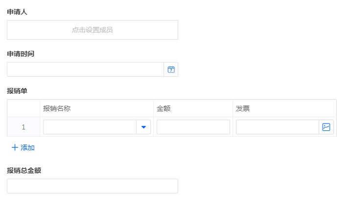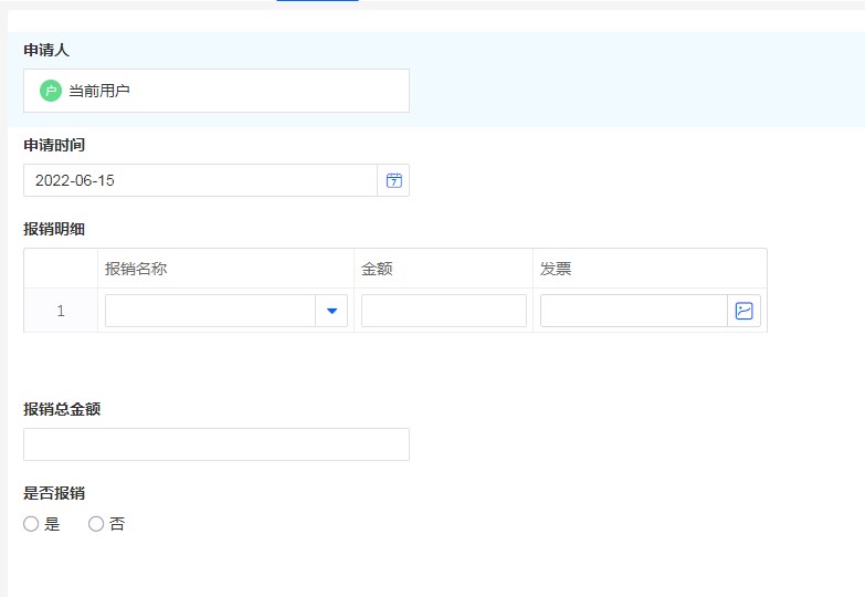1. 报销流程表单字段设计,下图展示了表单结构以及表单字段类型。