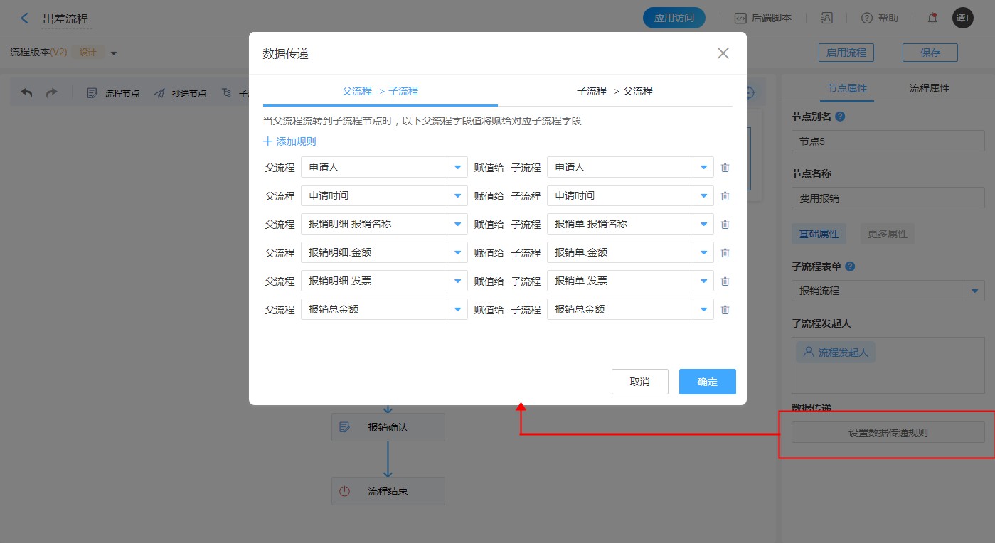 1. 设置数据传递规则,首先配置父流程>>子流程,实现当父流程流转到子流程节点时将父流程的相关字段自动赋值给子流程