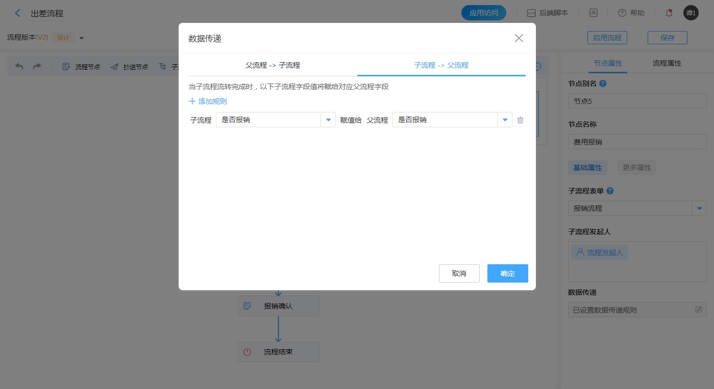 1. 然后设置子流程>>父流程,即当子流程的报销流程执行完毕时,将报销完成标示字段再回传给父流程,配置好后点击确认即可。