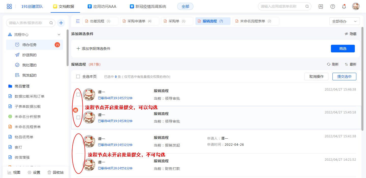 • 仅可在应用访问的「我的待办」处对流程进行批量提交,不可在工作台处的「待办任务」进行批量提交。