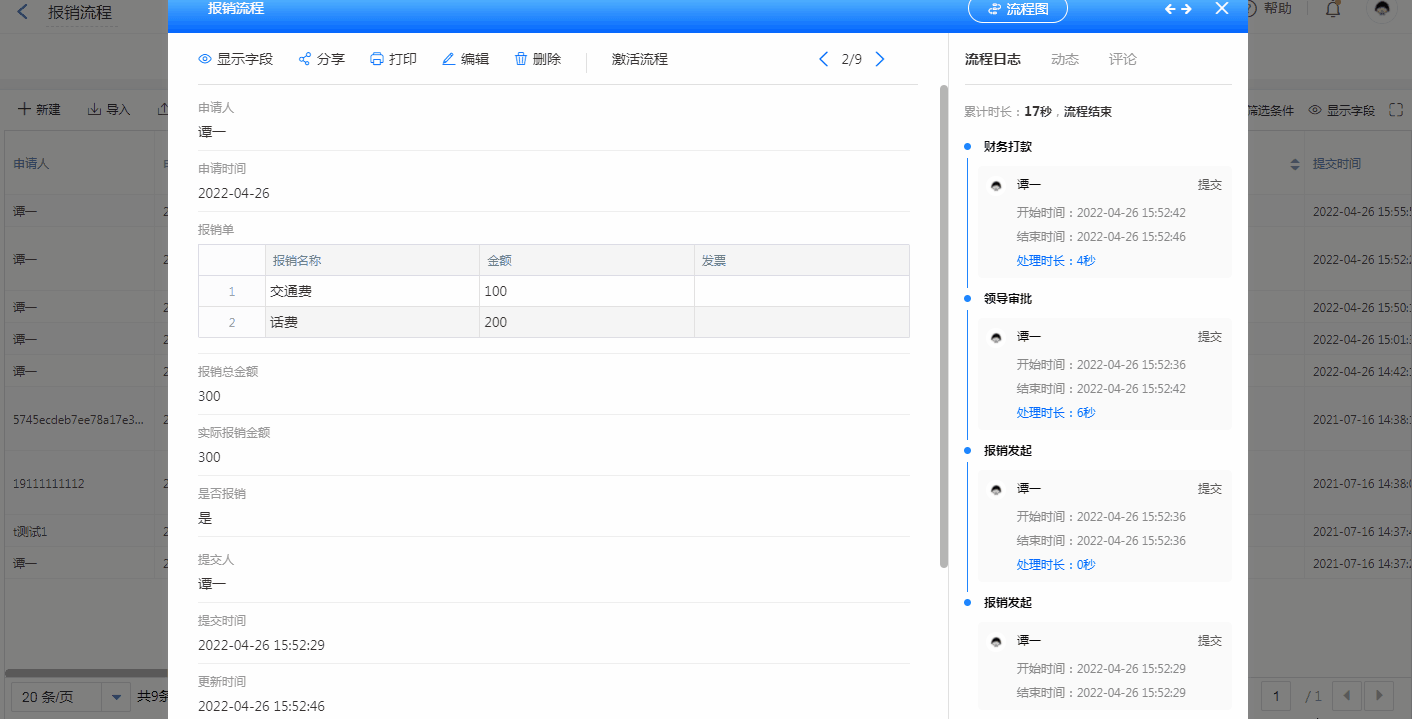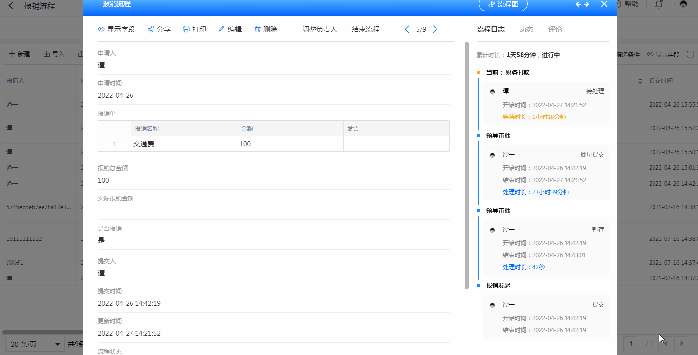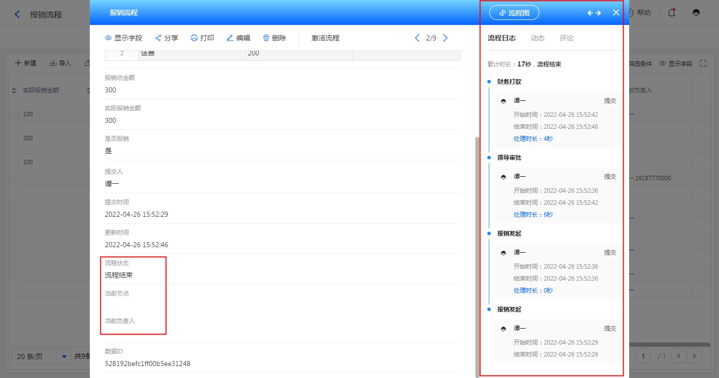 点击单条数据,可查看流程日志,流程图,流程节点等流程数据。