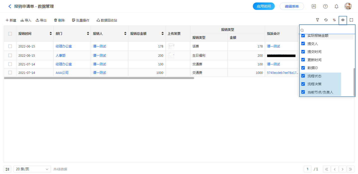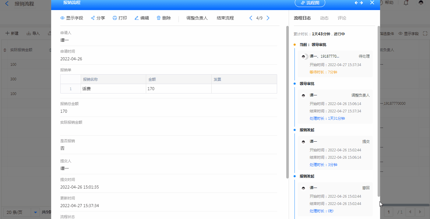 管理员在后台,可以在【数据管理】中对流程数据进行监控和管理。如查看流程进度、更改负责人等等。