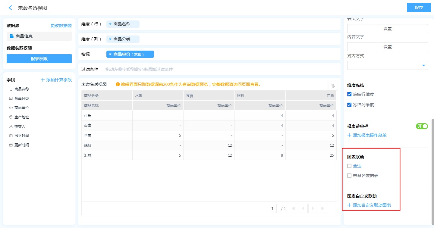 透视图支持和其他表单联动,联动目标支持同数据源的任何报表。主联动表中选择某个字段或某个数据,被联动表中会出现与之相应的数据。