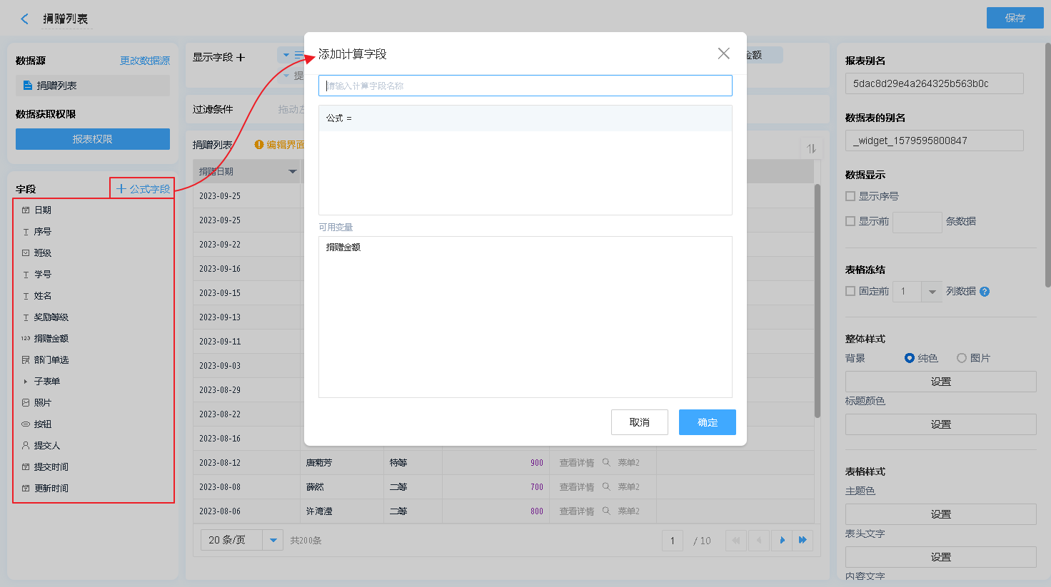 也可以通过增加公式字段,对报表中显示的内容进行简单的计算处理【支持绝大多数数学函数及+-*/四则运算】。