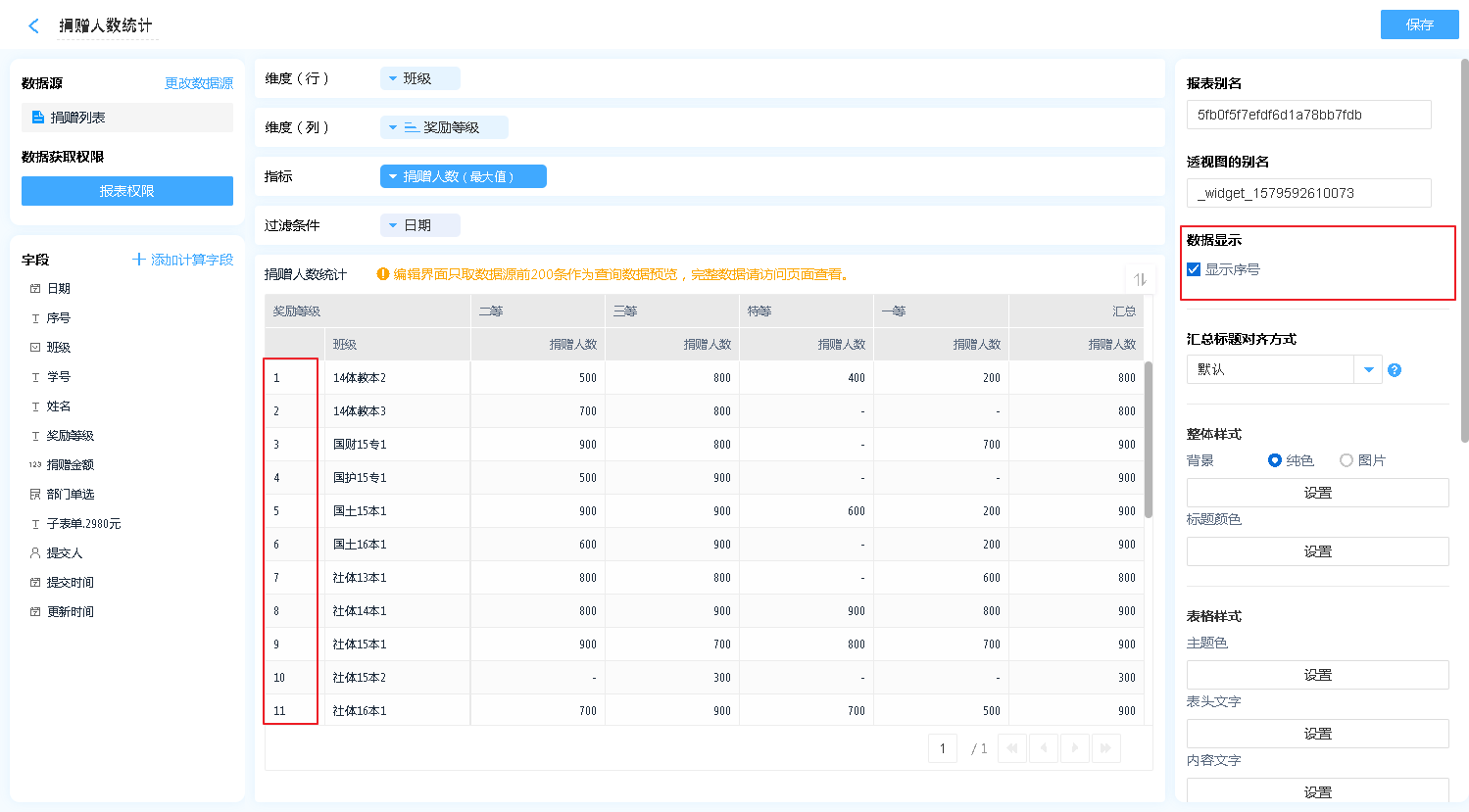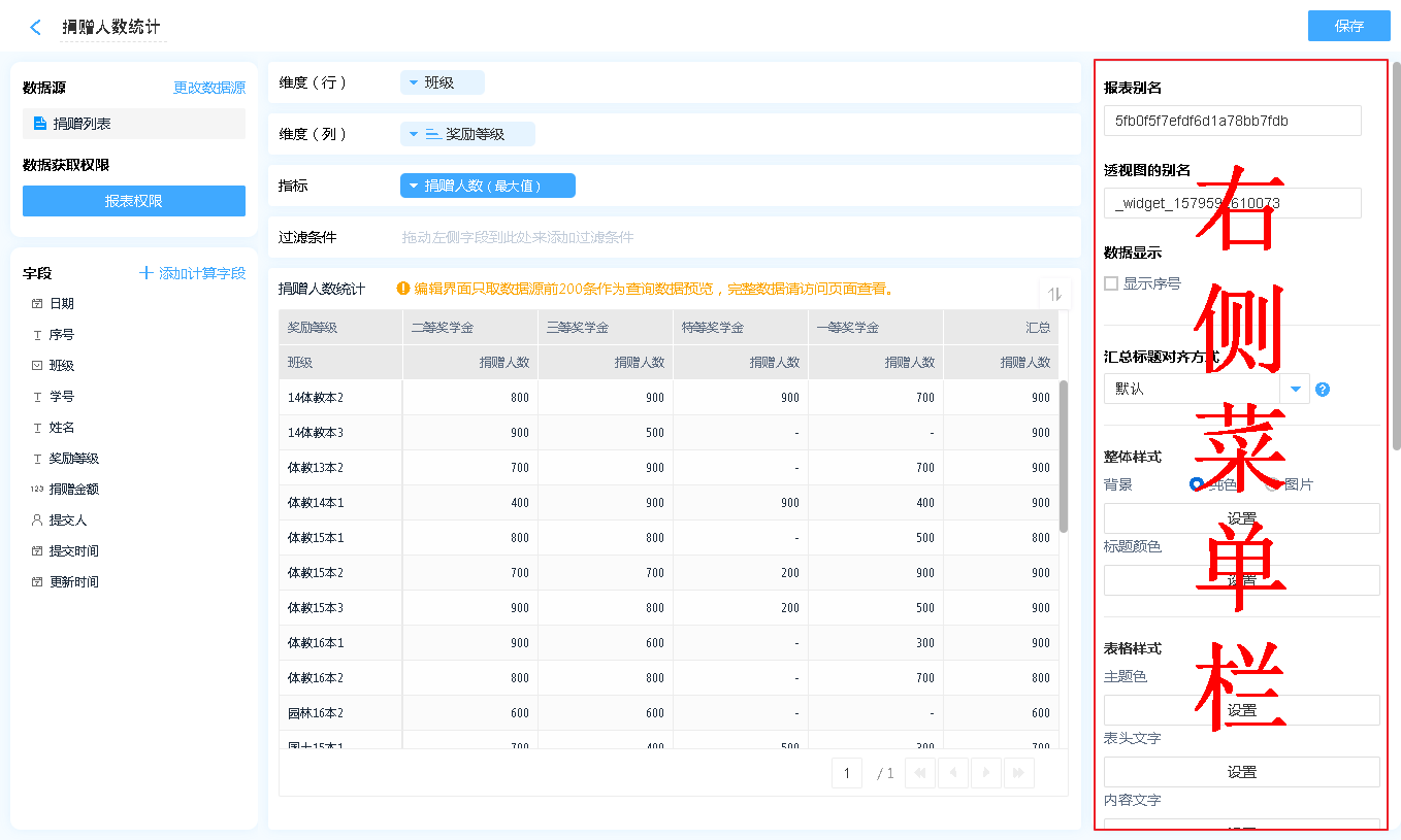 显示名称: 字段添加进入显示字段区域后,可自行修改其在数据表中的表头文字仅详情显示:选择后,当前字段在报表数据列表中隐藏,点击单条数据不受影响;反之亦然汇总方式: 仅日期时间字段可设置,可以设置按照何种日期格式对数据进行汇总(如:按年、按季度、按月汇总)排序:支持按照指定的格式对数据表内的数据进行排序[默认为数据创建时间]对齐方式:支持报表单元格文字的排列方式删除字段:此处的删除字段,是指从显示字段中删除,删除后仍可重新添加,不会对原表造成任何影响。