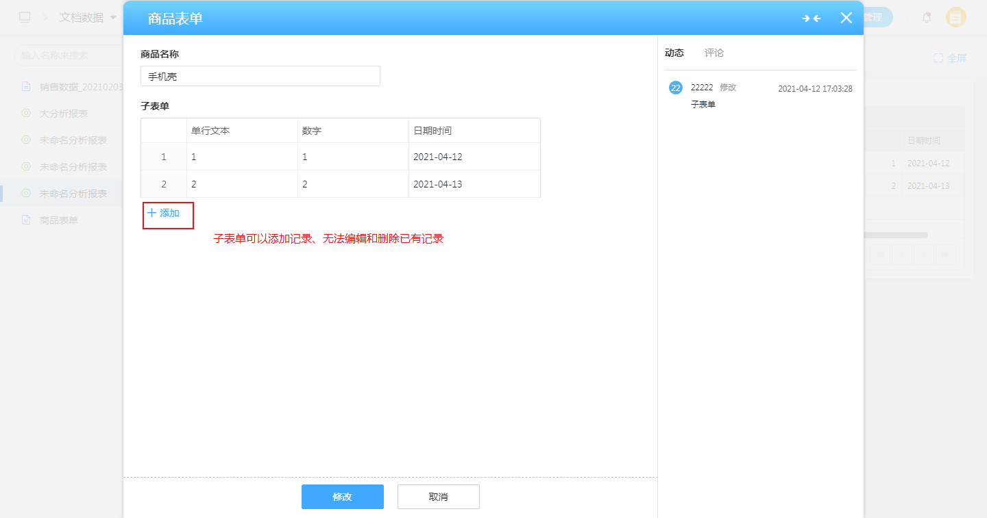 案例:如子表单仅勾可选新增记录,编辑已有记录和删除记录不勾选,在数据表访问页面,点击单条数据,进入数据详情中并编辑数据,发现子表单可以新增,但是无法编辑和删除已有记录。