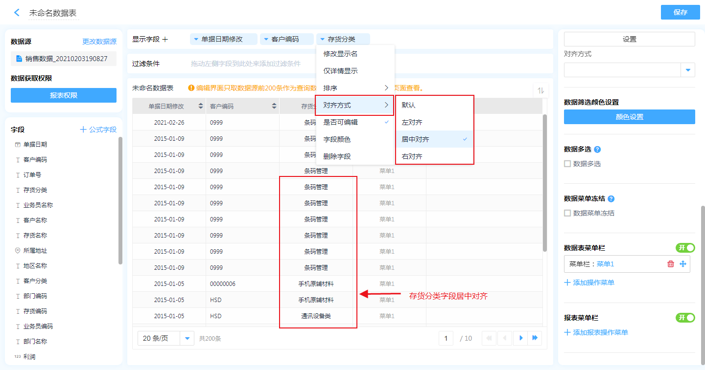 可以设置该字段的对齐方式。可设置为左对齐、居中对齐、右对齐。