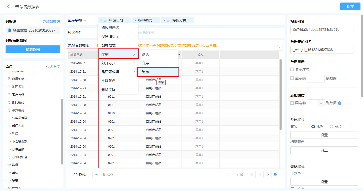 字段设置排序、点击表头排序及图表右上角排序入口排序,这三个入口的排序实现功能一致。