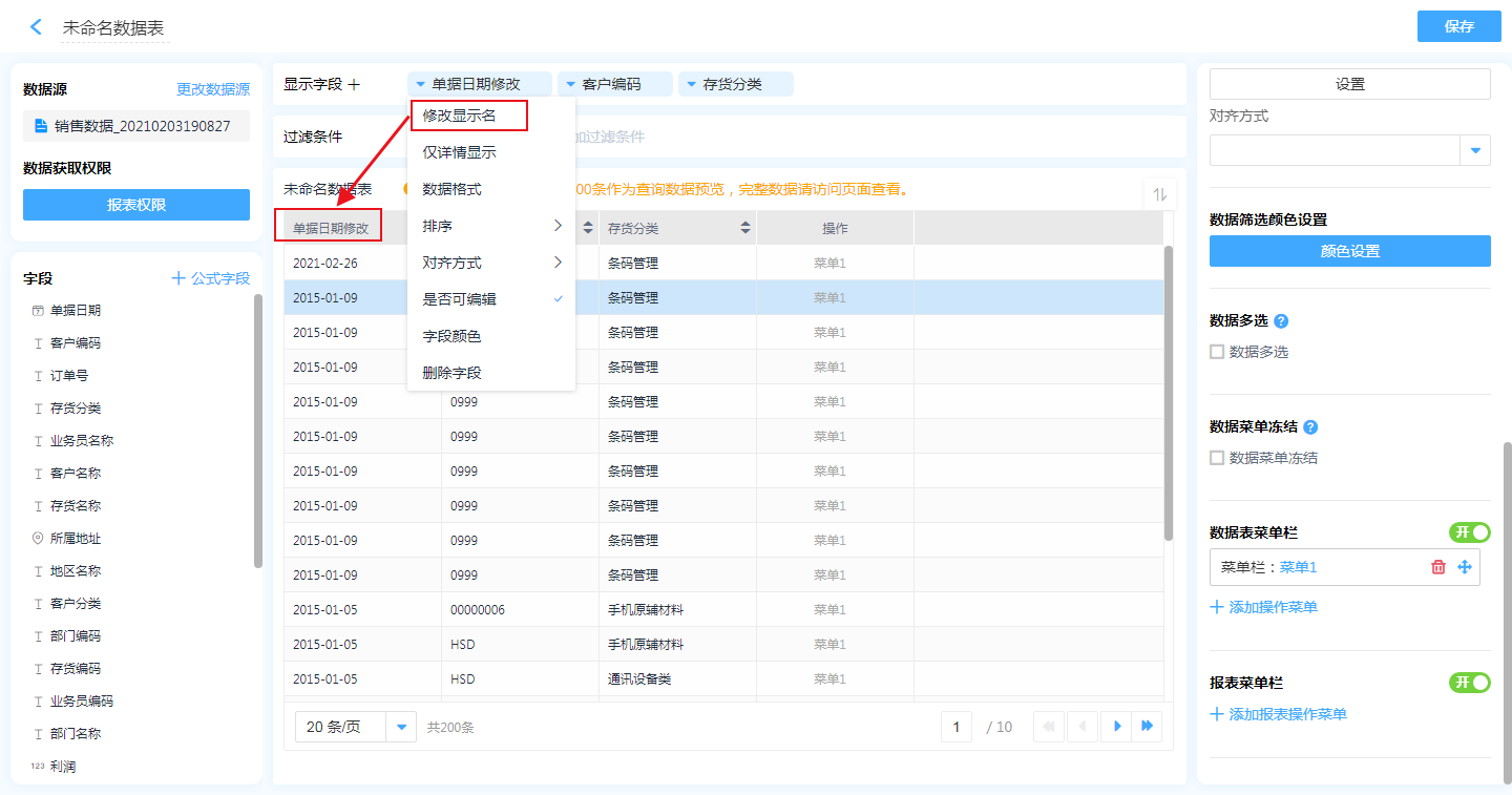 鼠标点击需要更改的字段,在下拉列表中点击「修改显示名」可以对字段重命名;