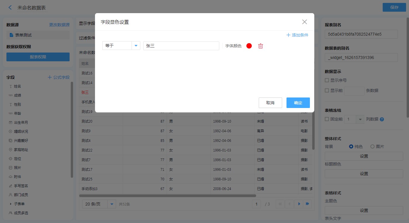 点击【选择显示字段】添加子表单里的字段,已经添加的字段则不可再添加。 - 子表单内的字段的更名
