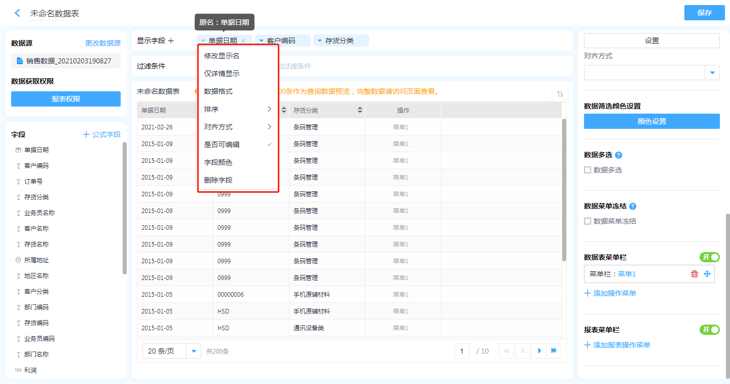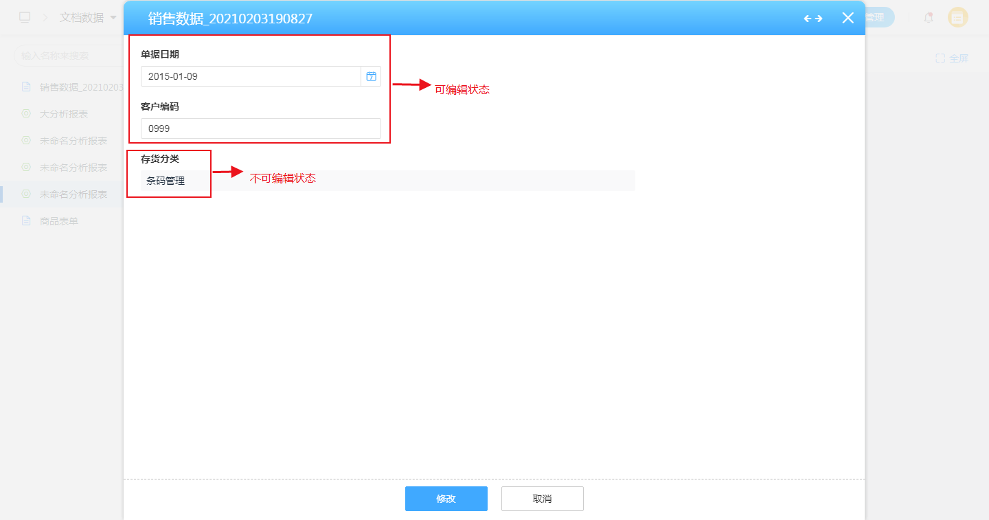2)在报表访问页面,点击数据表单条数据进入数据详情页,编辑该条数据,可以发现【单据日期】【客户编码】可编辑,【存货分类】不可编辑。