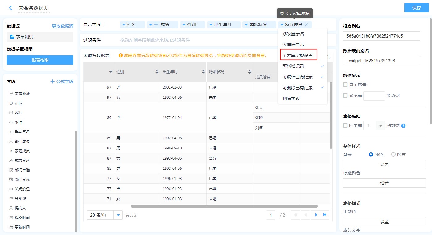 如果子表单里也有数字、日期和地址字段,那么在设置子表单的时候可以针对该类字段设置数据格式,数据格式的设置参考数据格式。