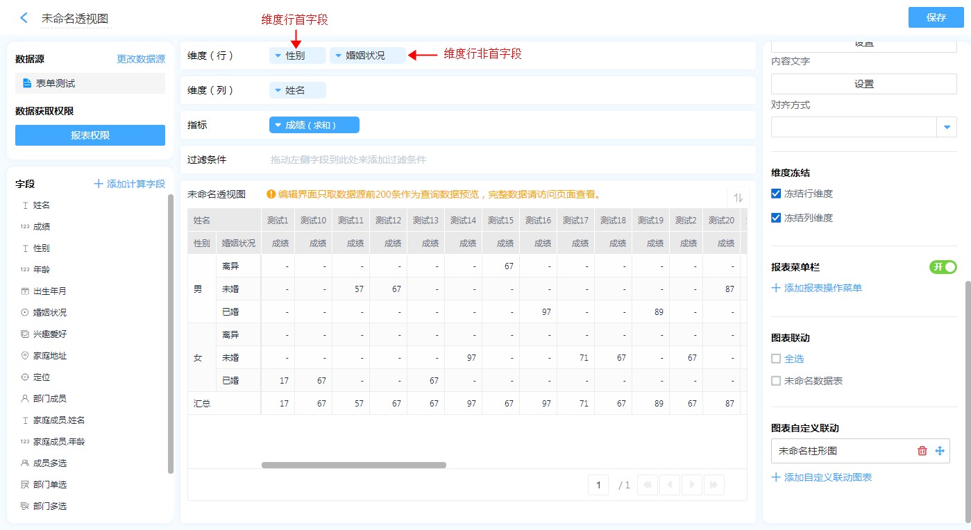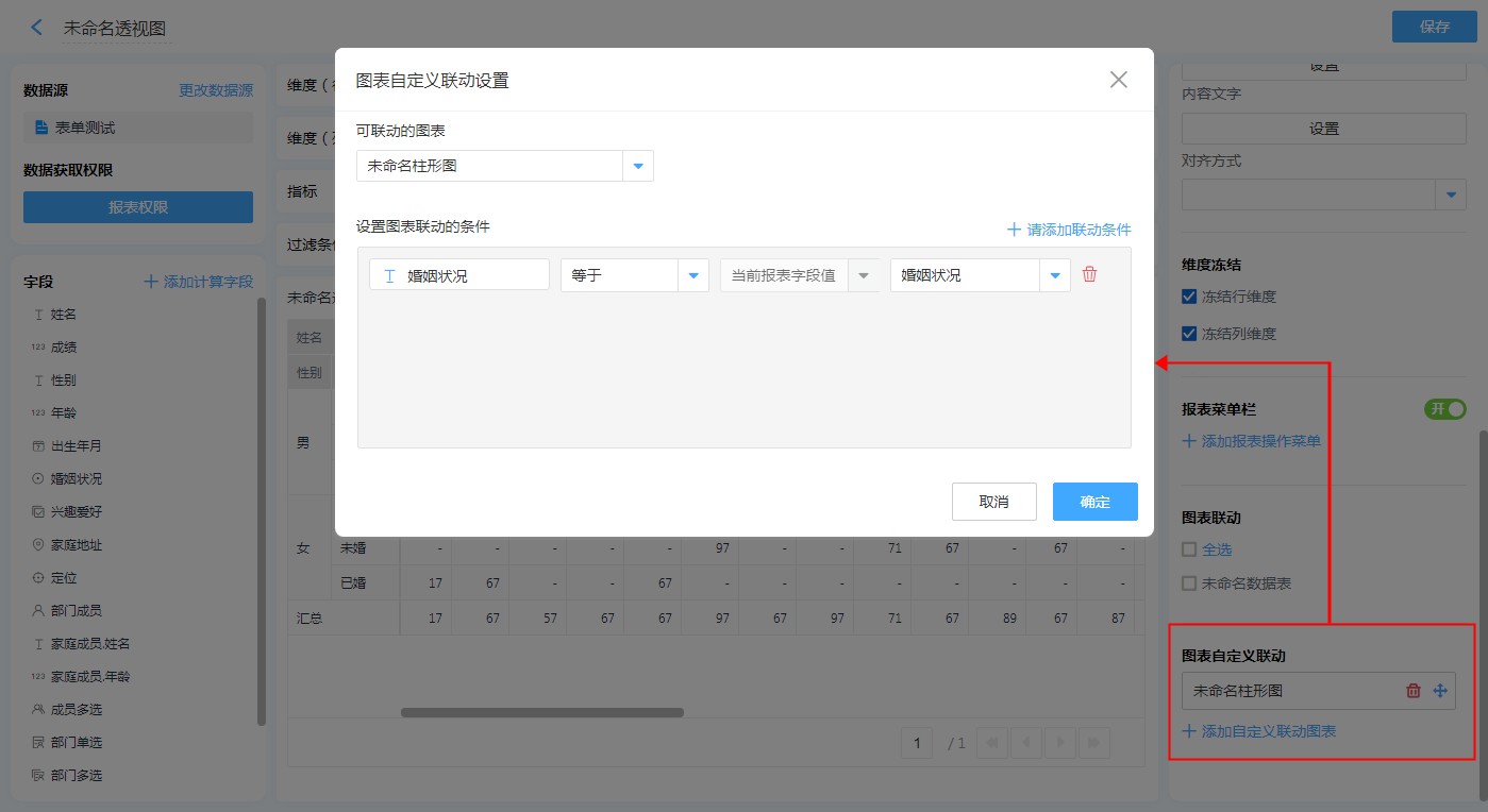 以透视图维度(行)的字段为图表自定义联动条件。