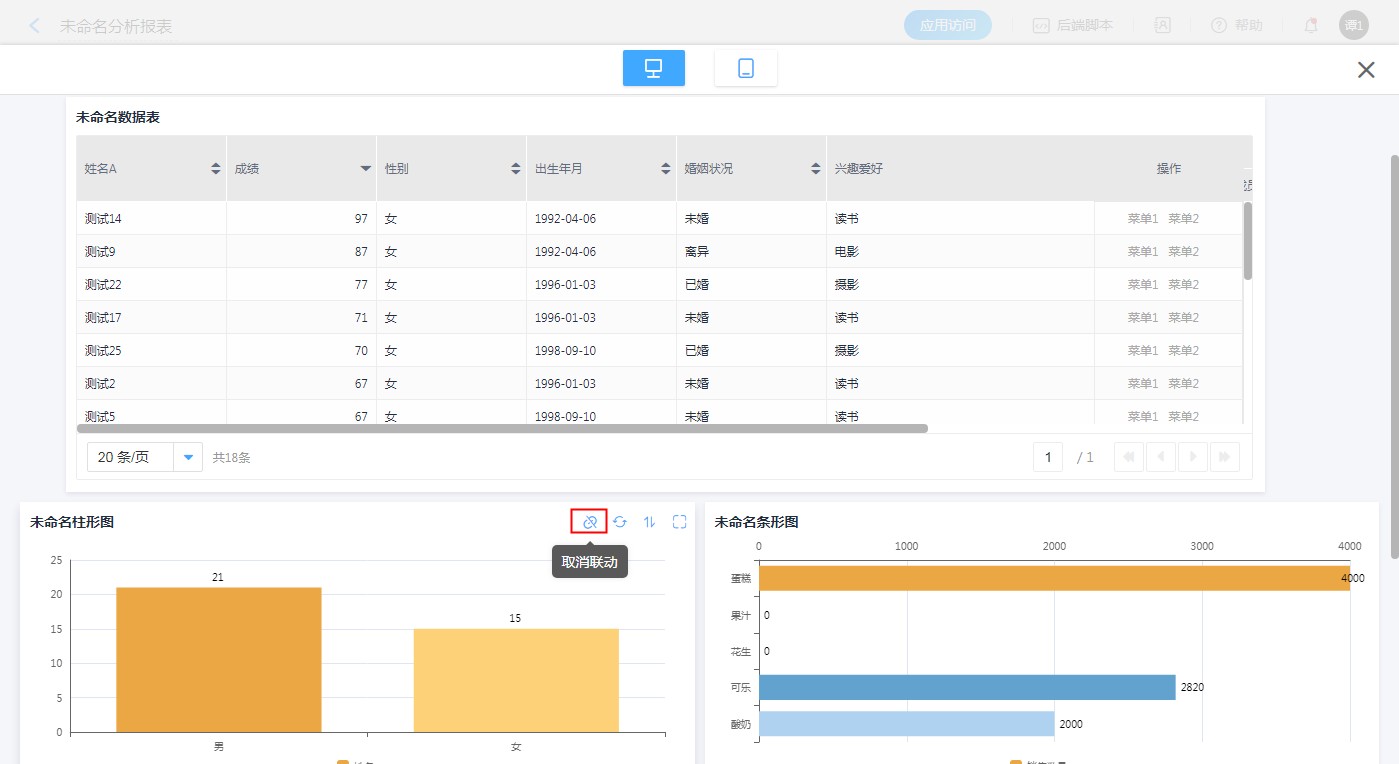 • 图表联动为同一数据源的图表可联动,图表自定义联动可为不同数据源的图表进行联动。