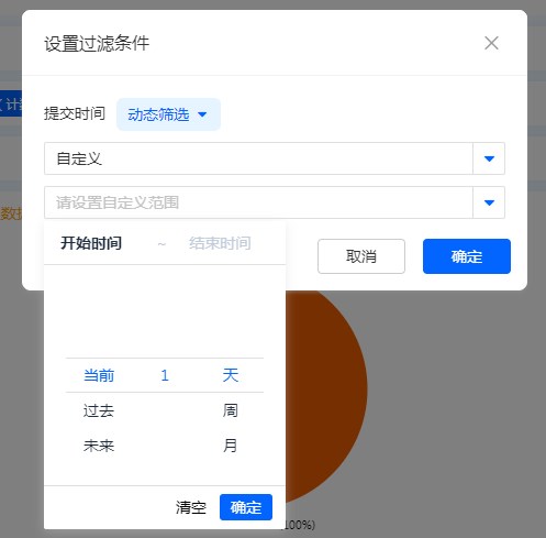 提交时间 等于、不等于、大于、大于等于、小于、小于等于、选择范围(自定义起始结束时间)、为空、不为空 固定值、今天、昨天、本周、上周、本月、上月、今年、过去七天