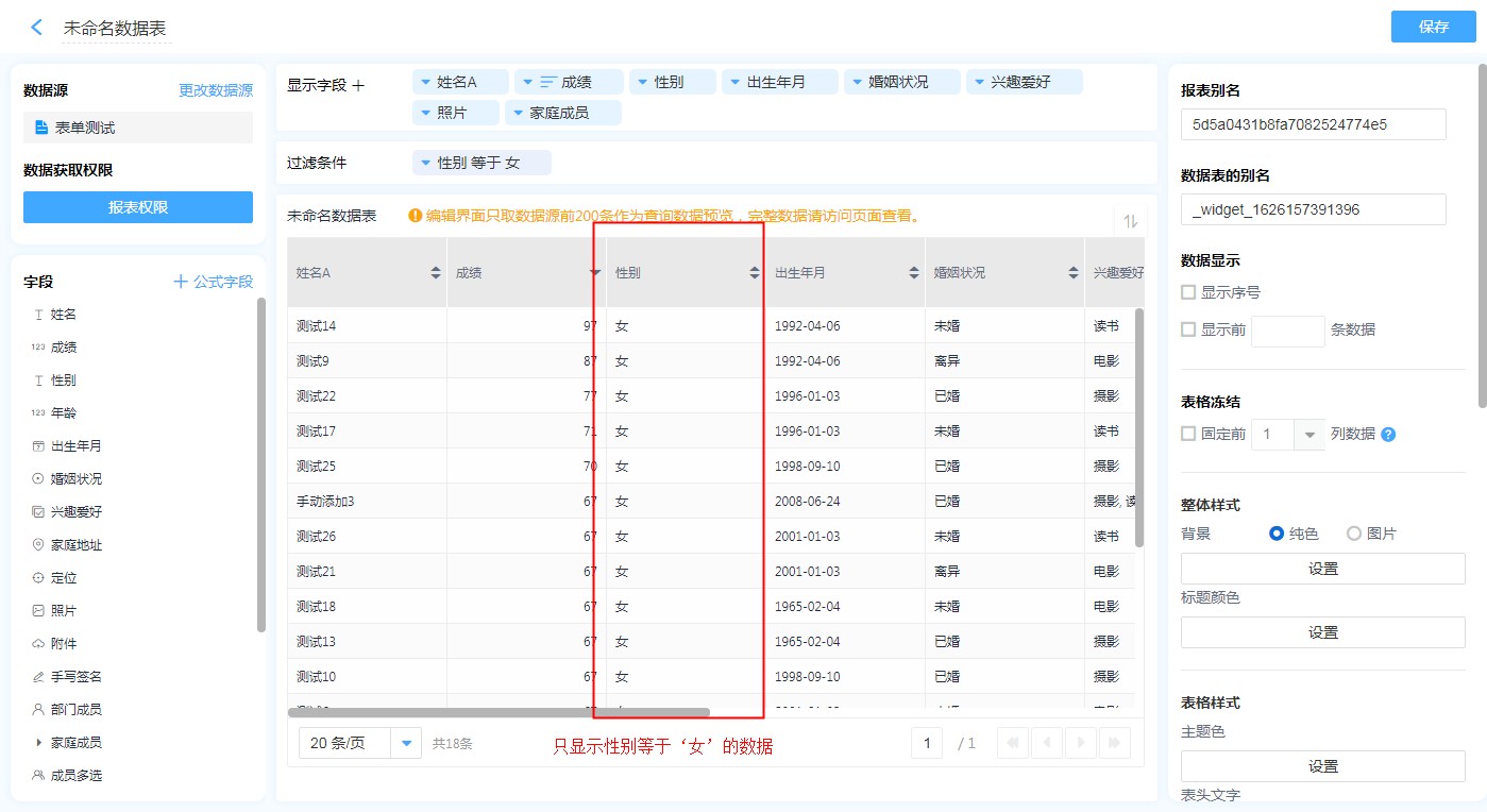 • 若设置了过滤条件,则报表中只出现满足条件的数据。