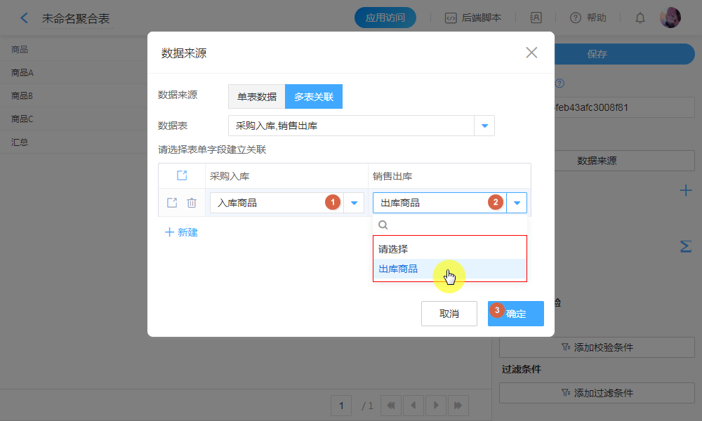 选择需要聚合计算的多张表单。