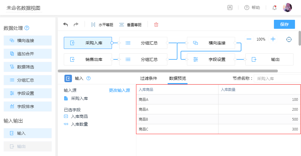 3. 配置:横向连接,以“商品”为连接字段,把出入两表数据进行横向拼接,把“入库”与“出库”数据横向拼接为一张表。
