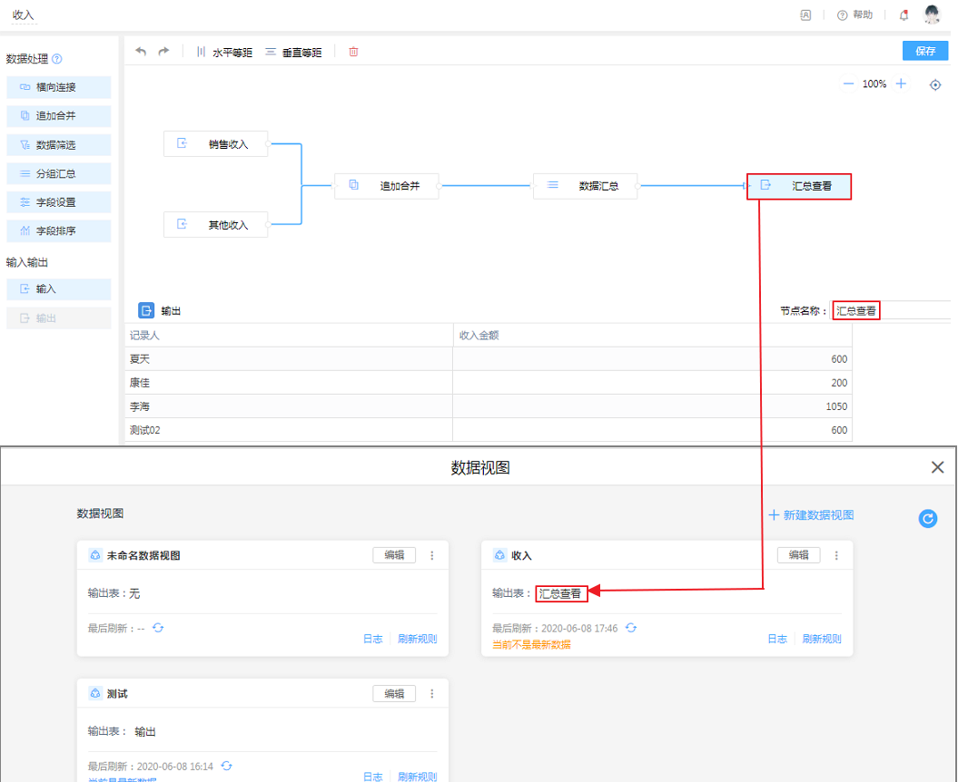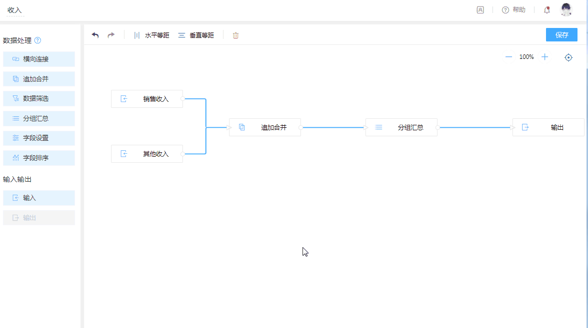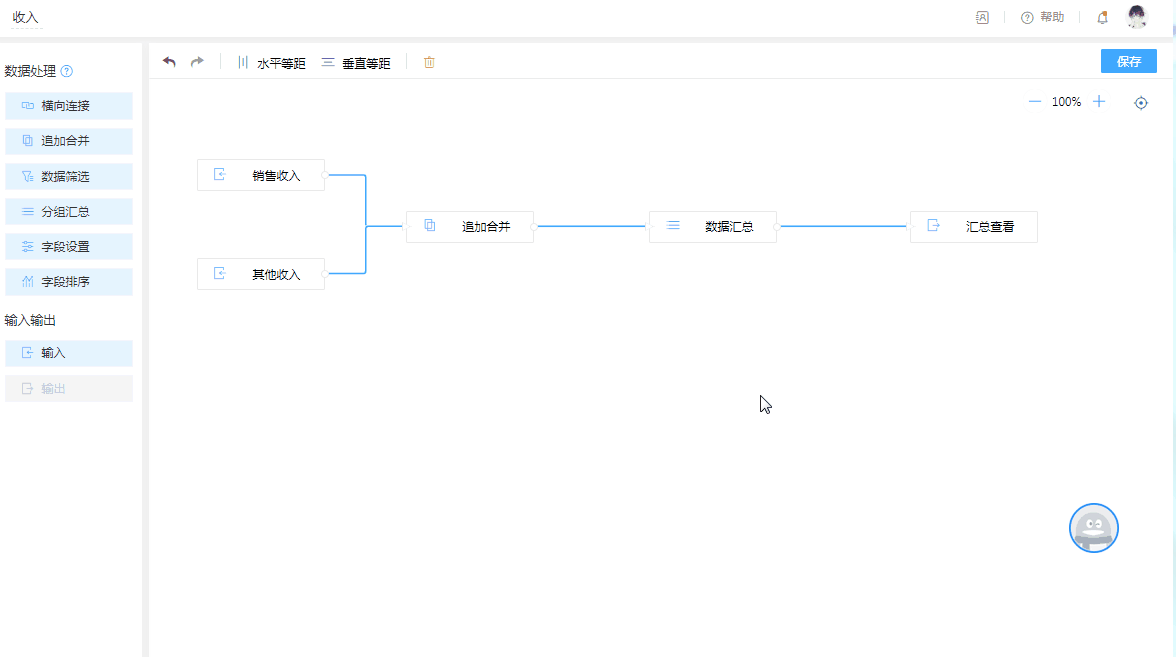 • 选中上一节点的输出端与下一节点的输入端进行首尾连接,整个数据视图设计完毕可以点击右上角的保存。