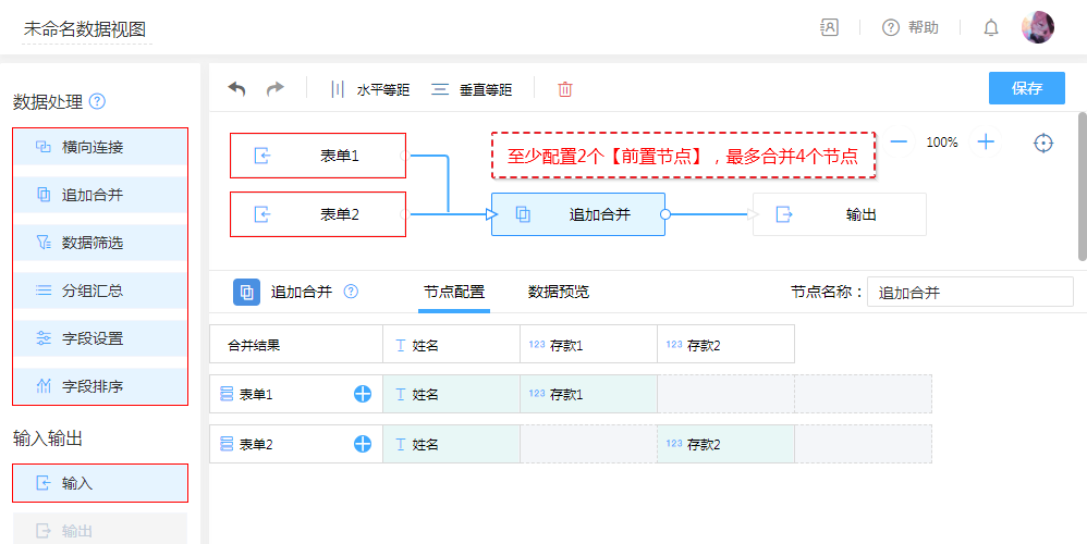 常用于将两个同类型表单合并到一张表里,默认将同类型同名字段合并为一列,对于同类型字段可以手动拖拽合并为一列。