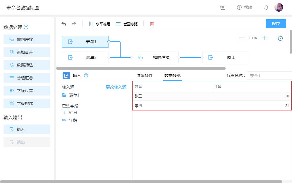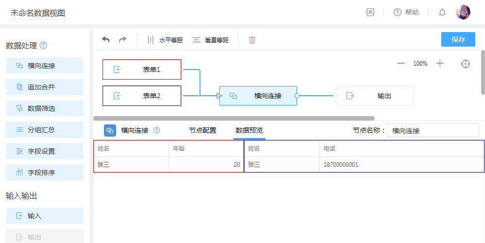 左连接:以“表单1”为主,根据“连接字段”为条件匹配“表单2”,条件字段值相同的数据将进行拼接,条件不符则忽略“表单2”的数据。