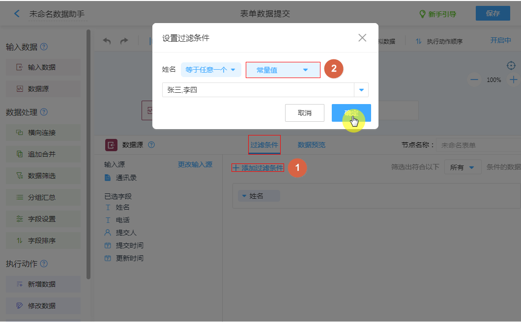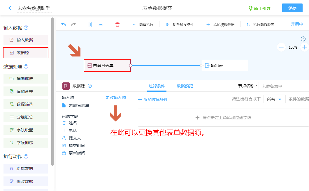 • 数据源默认配置下,是关联全表数据,可以配置“过滤条件”进行筛选符合条件的数据传入助手使用。