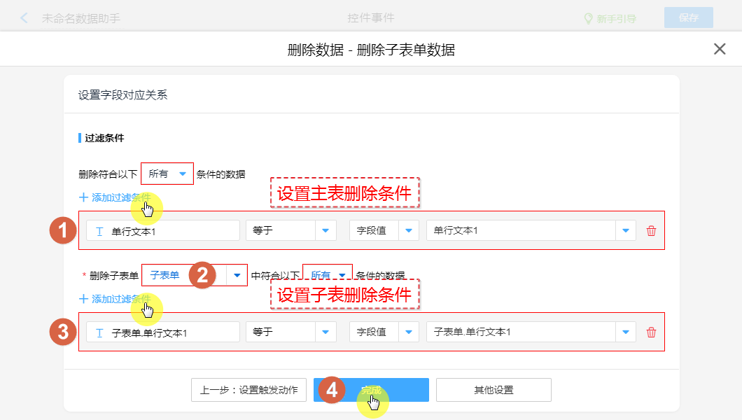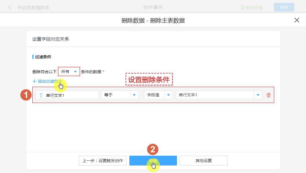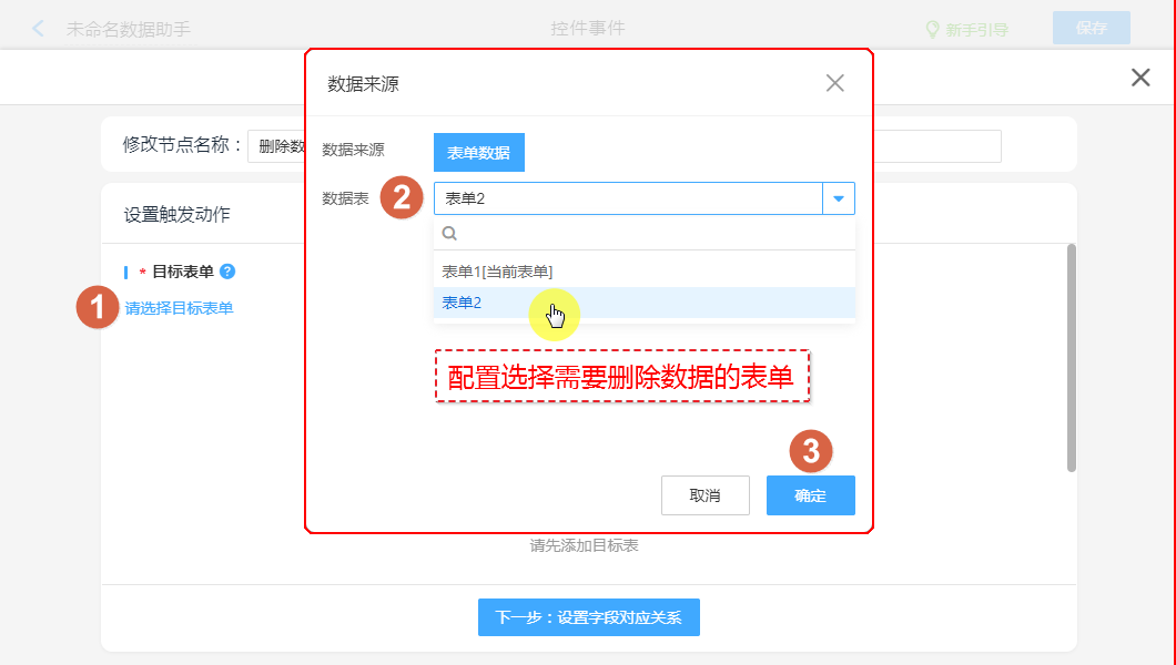 创建“删除数据”动作节点,将“输出表”的数据匹配其他表进行删除操作。