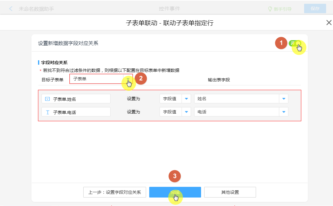 “数据表”有数据且条件符合,联动成功:返回“所配置的字段值”新增到当前子表单所匹配指定行。