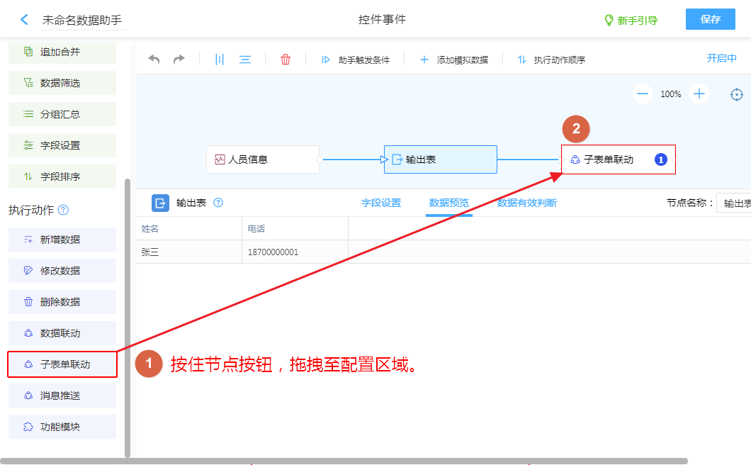 创建“子表单联动”动作节点,即可配置把“输出表”的数据,返回当前表子表单。