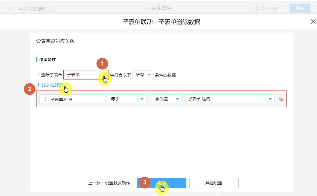 根据“姓名”为条件,删除子表单内符合条件的数据。