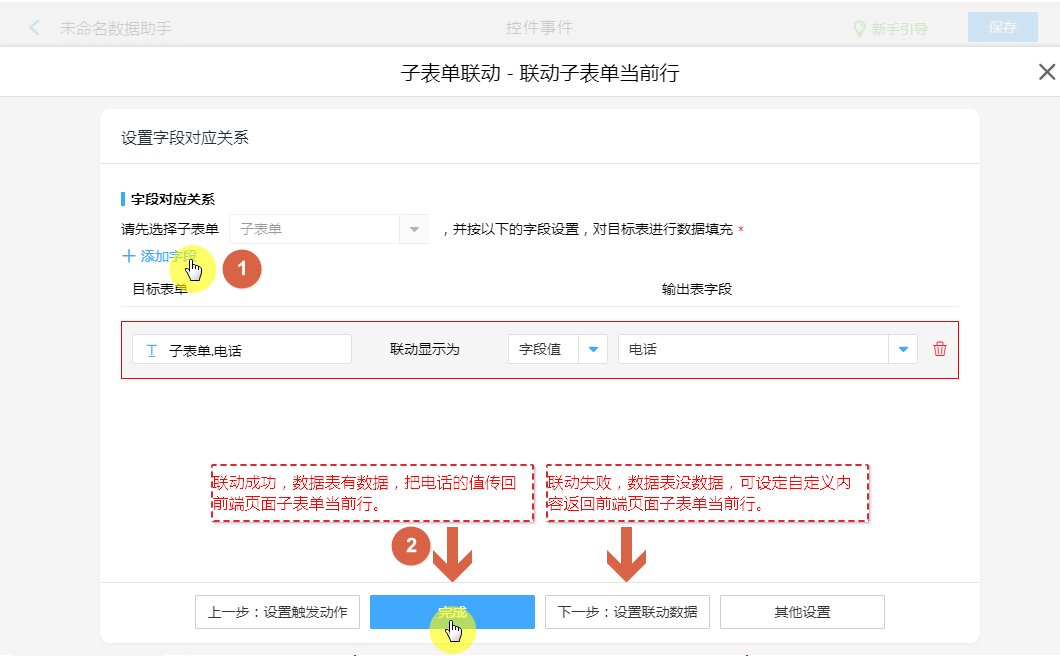 “数据表”有数据但条件不符,联动失败,返回“所配置的字段值”新增到当前子表单所匹配指定行。