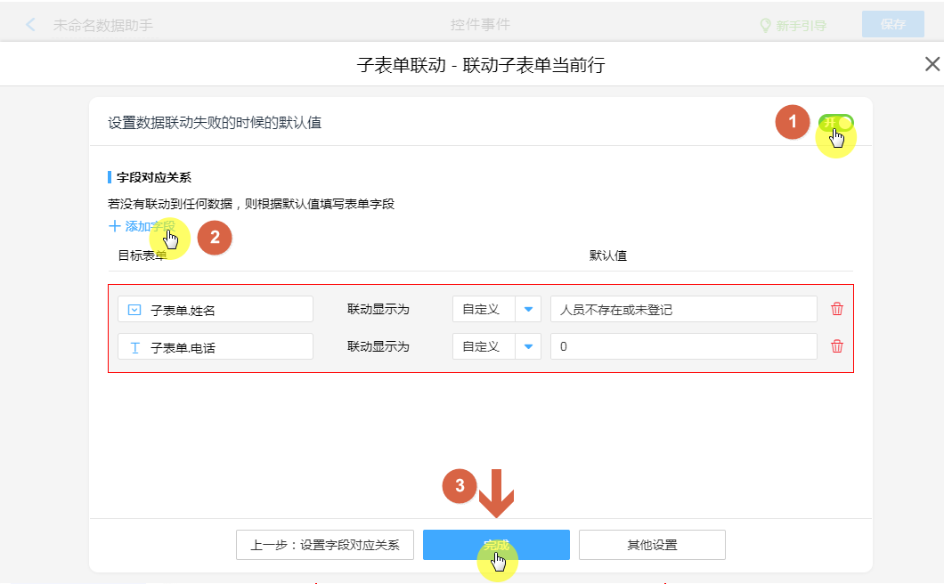 “数据表”没数据,联动失败:返回“配置自定义内容”替换到当前子表单所触发当前行。
